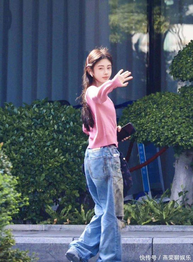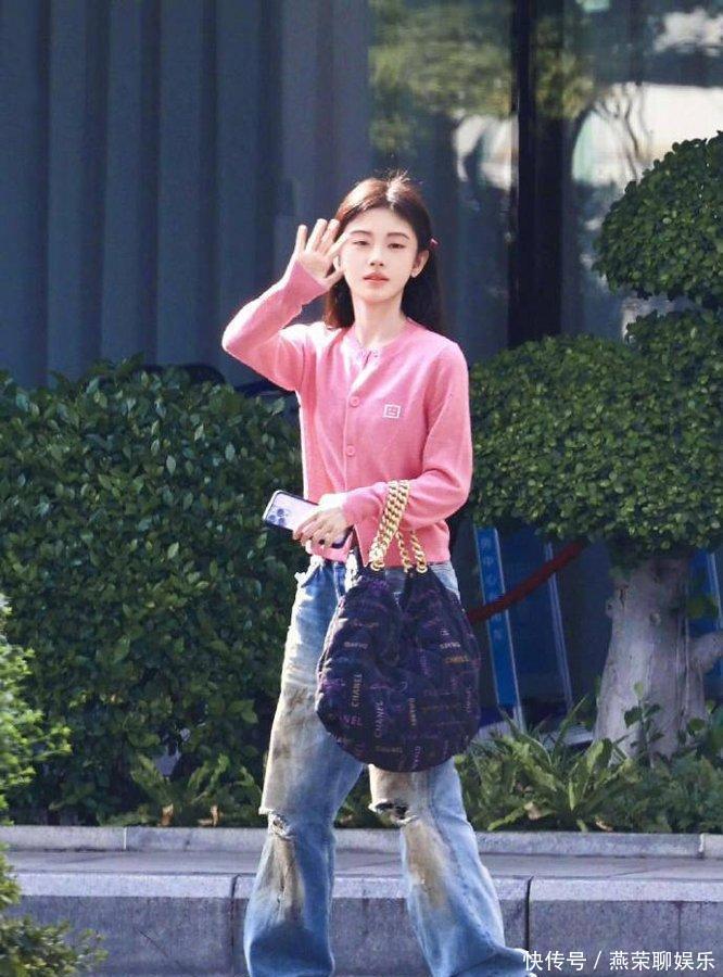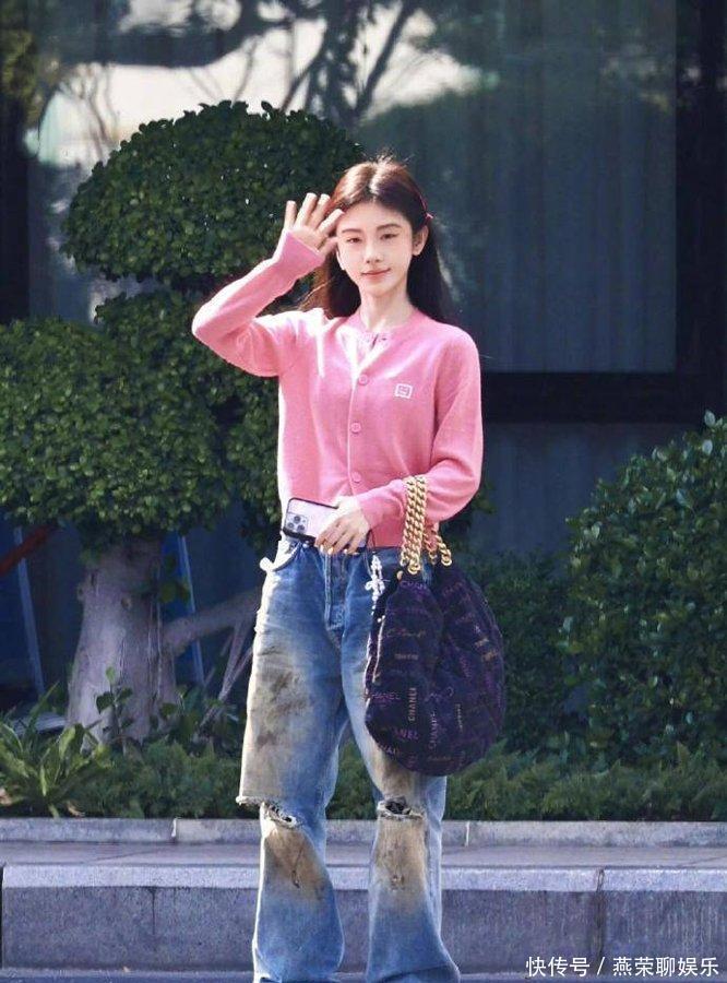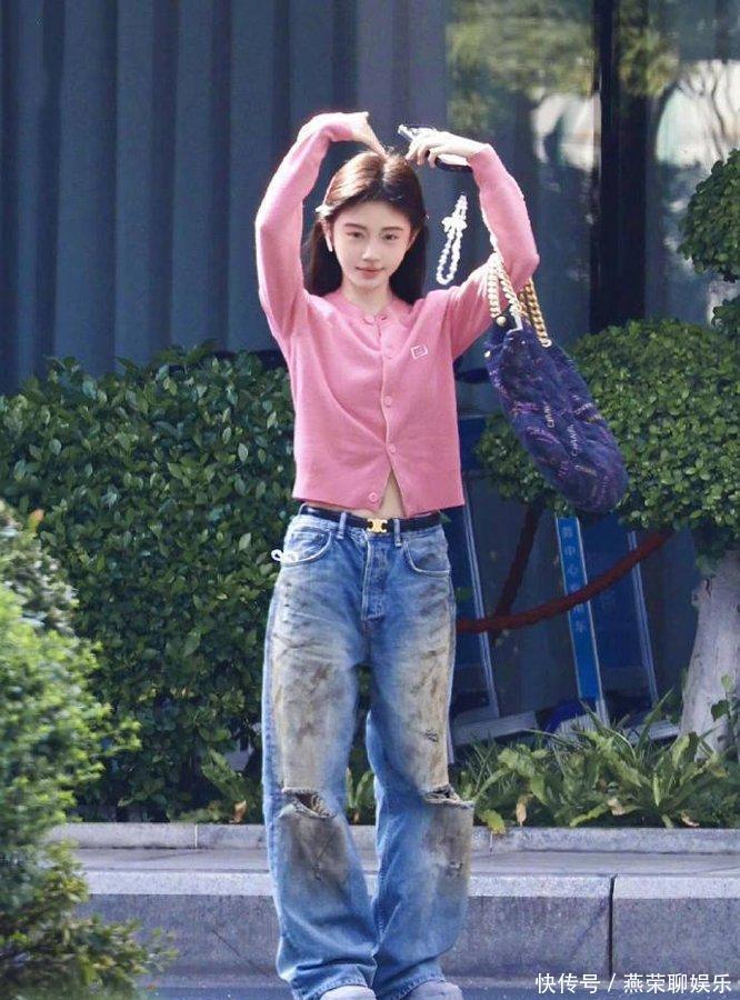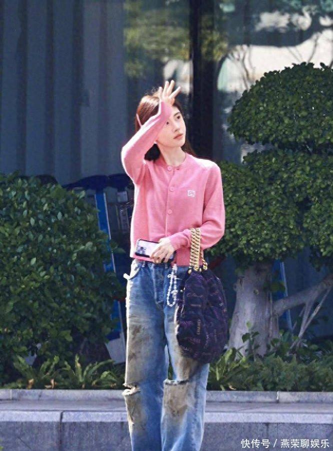 秋天穿衣服真的是个“技术活”——想保暖怕显臃肿,想好看又怕太刻意,早上对着衣柜发呆简直是常态。但鞠婧祎这一身搭配,算是把秋日穿搭的“平衡感”玩明白了,甜和野居然能揉得这么自然。粉色圆领针织衫本来容易“踩雷”,要么颜色太艳像年画,要么材质太硬显老气,但她选的那种软乎乎的低饱和粉,像秋日晒过的水蜜桃,温温柔柔的,穿在身上自带“减龄滤镜”。可光穿粉色多单调啊?下装直接配条做旧破洞牛仔裤——破洞的毛边、泛着旧意的底色,像给甜丝丝的粉色撒了把“粗颗粒盐”,一下子把甜腻感中和掉了,反而带出点随性的野劲儿,就像奶茶里加了点咸奶盖,意外的清爽。